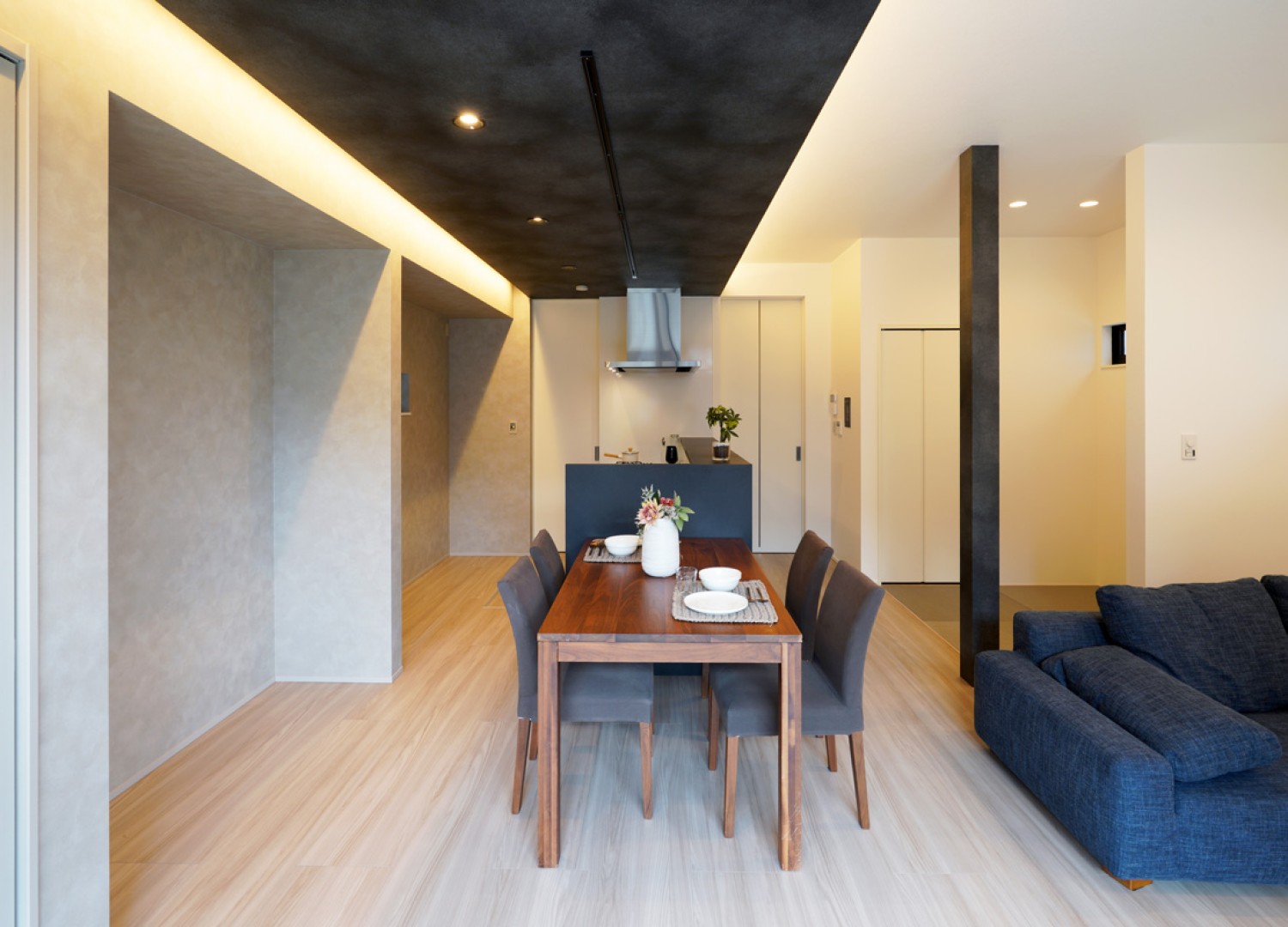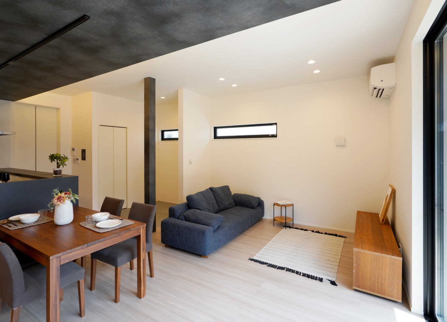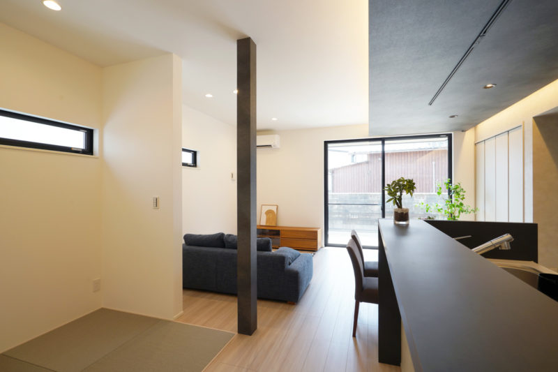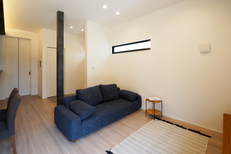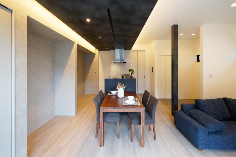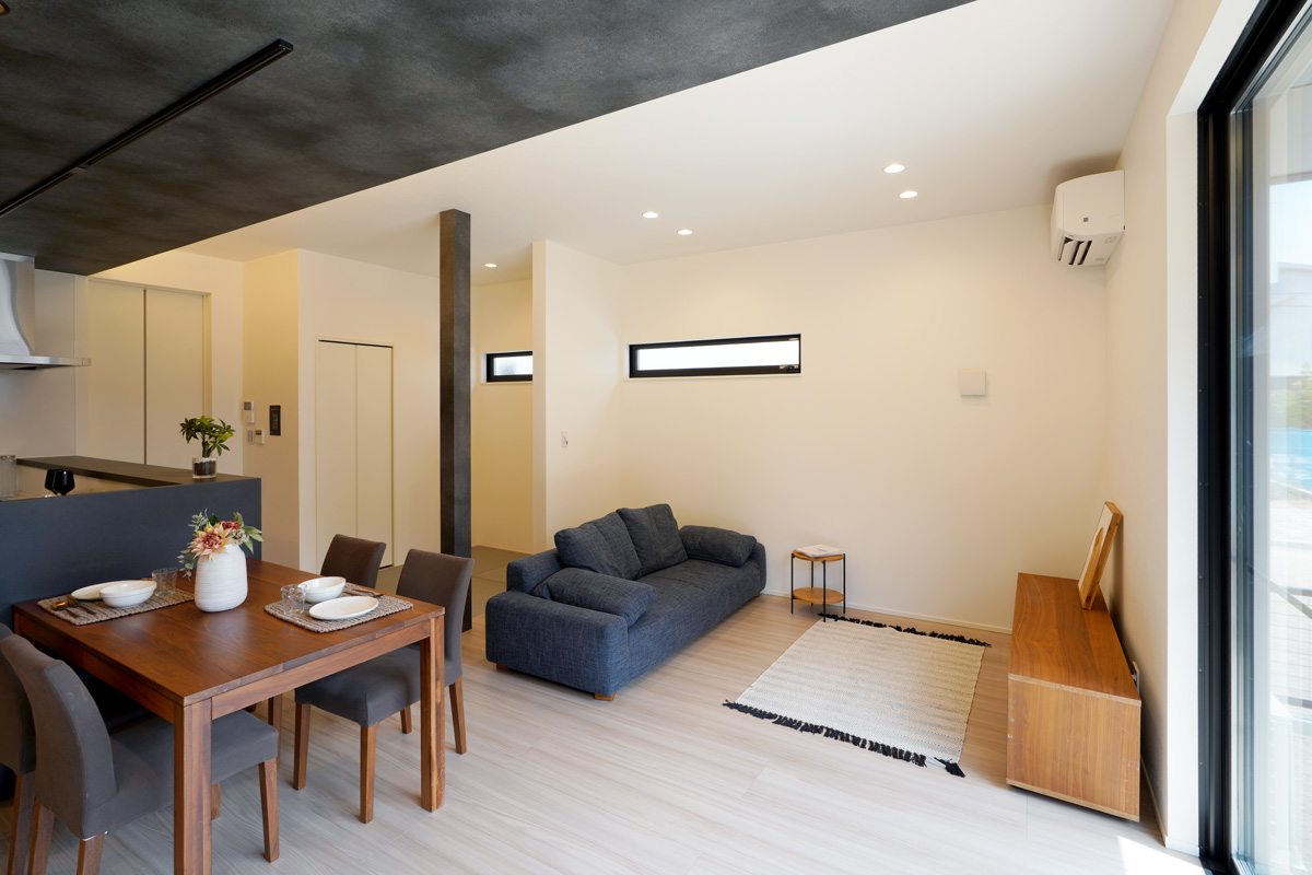 TOSCOの家はリビング天井高2.7mが標準仕様。一般的には2.4mが多いなか、約30cm高く設定しています。皆の集まるリビングの天井を高~くしました。開放的な空間をお楽しみください。